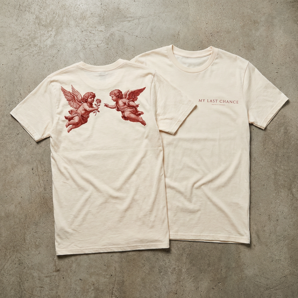 The Love Struck Tee blends timeless romance with modern streetwear. Crafted on a premium heavyweight cream blank, this piece features subtle “My Last Chance” branding on the front and a striking twin-cherub graphic on the back—symbolizing connection, devotion, and destiny.